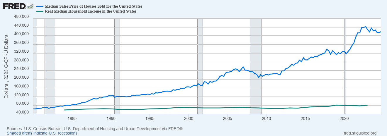 On the other hand, the wealthiest citizens living expenses are easily met via passive income which can then be used to buy more assets. As wealth gets increasingly concentrated the wealthy have to compete among themselves to buy these assets causing asset prices go up and making it even more difficult for lower income households to purchase them. For instance, the graph below shows the increase of US home prices compared to median household income.