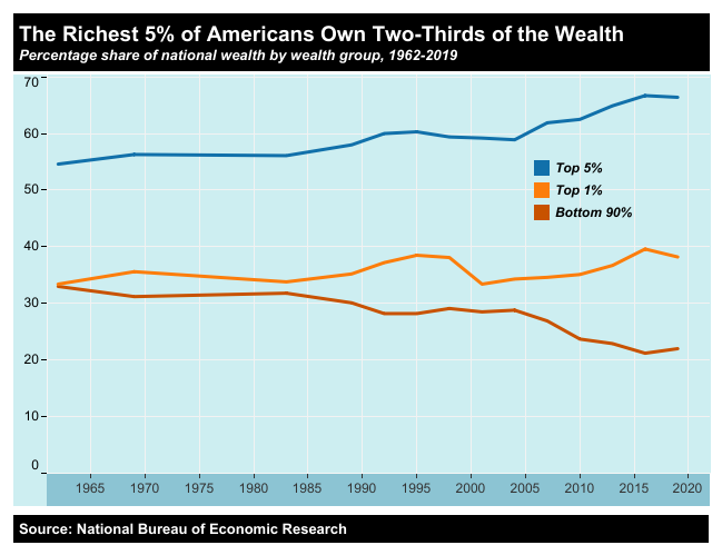 But the average household earns their money in the form of wages and spends the majority of what they receive on expenses like food and shelter. For the poorest, who live paycheck to paycheck, there is little to no opportunity to save or invest. Those in the middle class may be able to save and invest a small portion of their income, for example in a house and/or 401K. But their house is usually shelter and not a particularly valuable or liquid investment5 and a 401K typically generates a fairly small percentage of their income requirements and isn’t readily accessible.